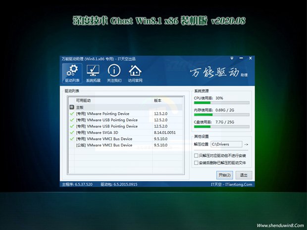 深度技术Windows8.1 2020.08 32位 官网装机版关闭用户帐户控制UAC、去除可执行文件小盾牌,针对系统运行程序的时候可能会出现错误的情况作了细致优化,自动安装驱动、优化程序,实现系统的最大性能,集成了大量驱动,也可以适应其它电脑系统安装,深度技术Windows8.1 2020.08 32位 官网装机版共享访问禁止空密码登陆,默认关闭局域网共享,关闭管理默认共享加快局域网访问速度和加快开机速度。深度技术Ghost Win8.1x86位装机版v202008版本以系统稳定为第一制作要点,收集市场常用硬件驱动程序,制作之前预先优化服务、启动项,给你一个开机快速的,运行流畅的win8.1系统。安装方便快速,支持多种安装方式。