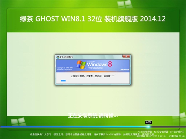 绿茶 GHOST W8.1 32位 装机旗舰版本系统主要适用于笔记本、品牌机,同时支持组装兼容性极强,可通过微软验证,可在线更新,可放宽心安心使用。智能判断自动卸载多余设备驱动,节省大部分的内存空间,自动清除系统盘病毒侵略。不含任何病毒、木马或者流氓软件,放心安装使用。安装过程实现全自动进程,通过一键便可完成所有程序的安装。适合电脑城,个人快速装机使用!