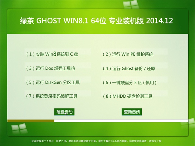 1、系统版本:绿茶 GHOST W8.1 64位 专业装机版 2014.12