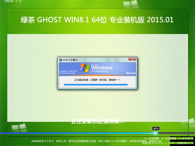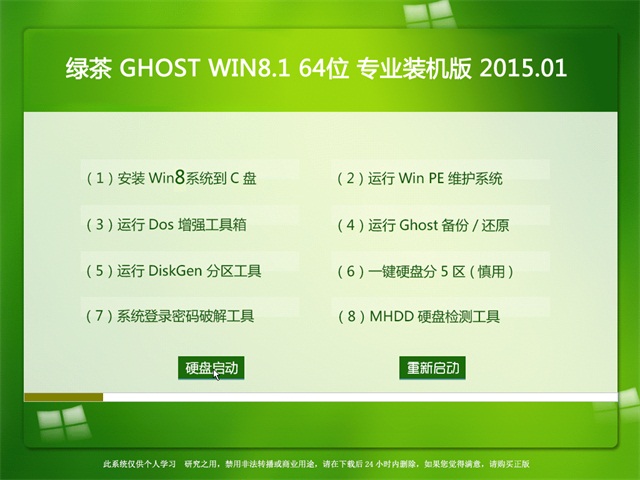 1、系统版本:绿茶 GHOST W8.1 64位 专业装机版 2015.01