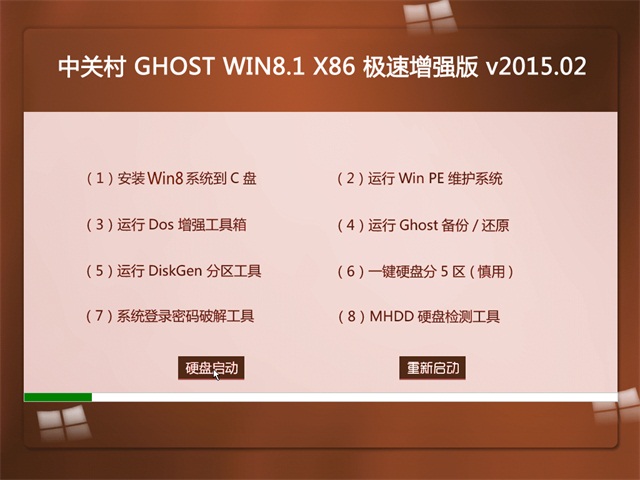 中关村系统 GHOST WIN8.1 X86 极速增强版 v2015.02安装全过程约6分钟,部分机子可达5分钟,高效的装机过程,兼营性、稳定性、安全性较均强,完全无人值守自动安装。集成了自2015年流行的各种硬件驱动,首次进入系统即全部硬件已安装完毕。数台不同硬件型号计算机测试安装均无蓝屏现象,硬件完美驱动系统经过优化,启动服务经过仔细筛选确保优化的同时保证系统的稳定,内存消耗低。欢迎广大用户安装体验!