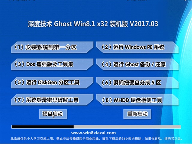 深度技术Win8.1x32位系统仅用于进行演示基于万能GHOST的快速部署技术,供装机维护技术人员参考,我们不承担任何技术及版权问题,且不对任何资源负法律责任。所有资源请在下载后24小时内删除。如果您觉得满意,请购买正版 !!!