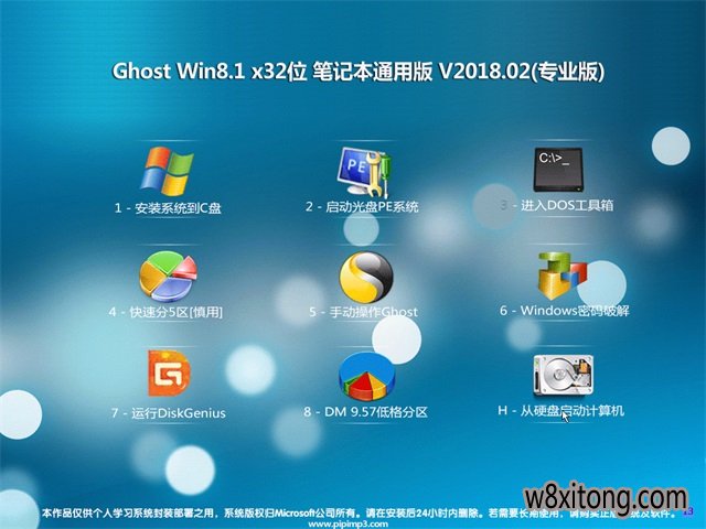 大白菜Win8.1x32位笔记本通用版系统仅用于进行演示基于万能GHOST的快速部署技术,供装机维护技术人员参考,我们不承担任何技术及版权问题,且不对任何资源负法律责任。所有资源请在下载后24小时内删除。如果您觉得满意,请购买正版 !!!