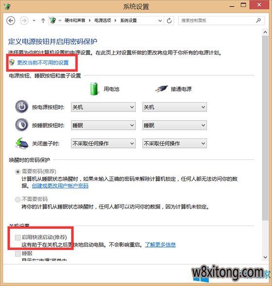 然后单击“更改当前不可用设置”,之后将“启用快速启动”前的狗去掉后保存。