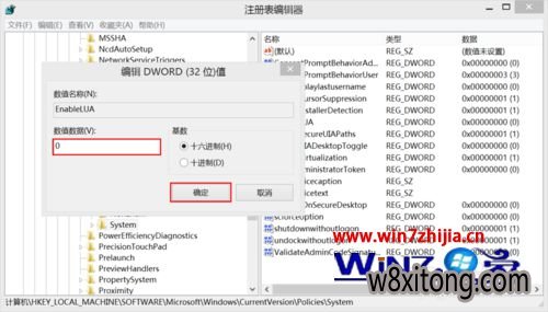 10、把“EnableLUA”的值从“1”改成“0”,打开“确定”按钮。