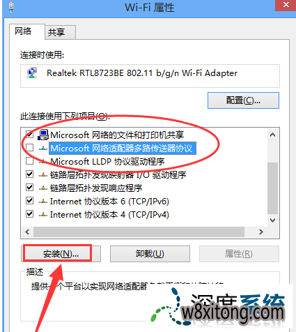 在网络设置对话框,找到【Microsoft网络适配器多路传送协议】选中,然后打开左下角【安装】