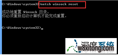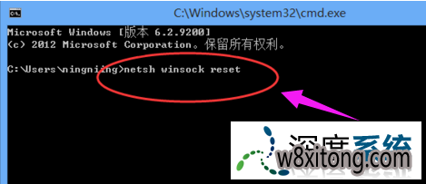 进入命令行界面,写入 netsh winsock reset 命令,打开确定