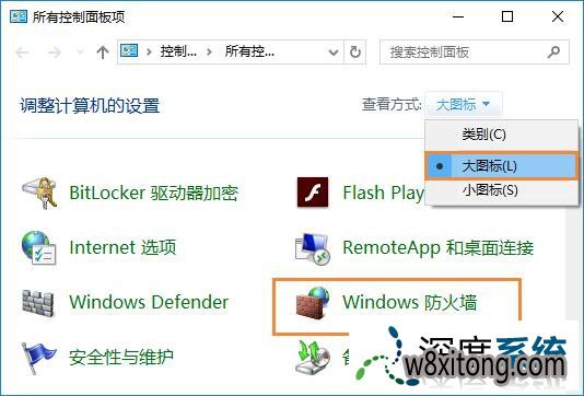 1、打开控制面板,将查看方式修改为【大图片】,在下面打开【windows 防火墙】便可进行详细设置,如图所示: