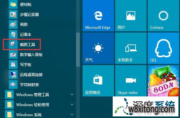 打开深度win8的开始菜单,在跳出菜单里选中截图工具。