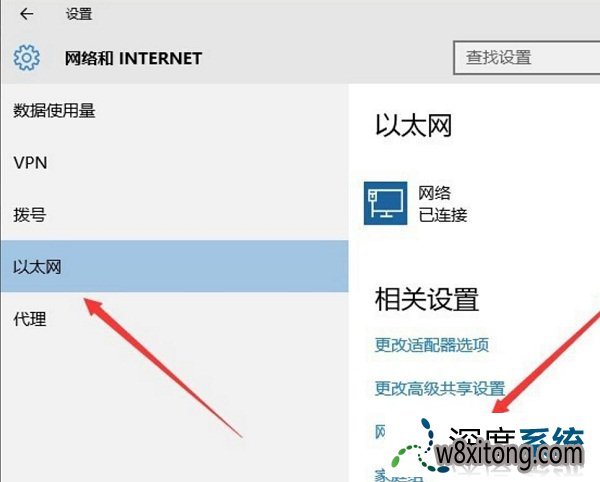 第二步:进入网络和internet界面,选中左边的以太网,然后在右边选中更改适配器选项,如下图: