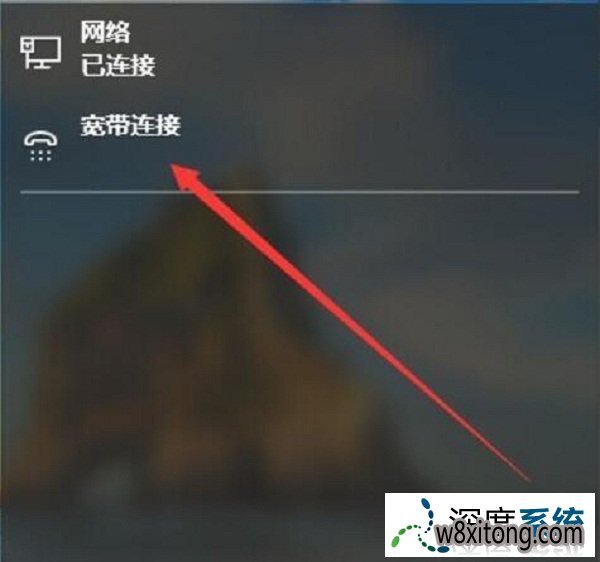 第一步:在桌面右下角的网络图片打开一下,然后选中宽带链接,如下图:
