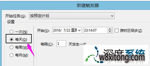 在触发器窗口中,选中每天。(依据实际需求决定)