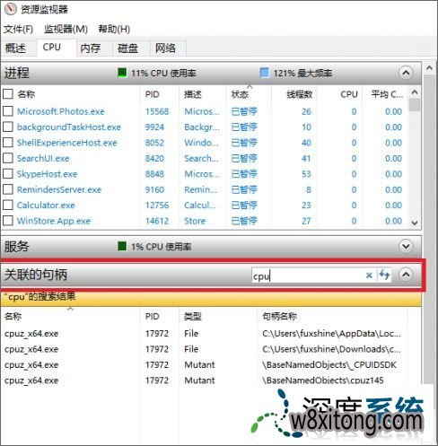 2、切换到“CpU”选项卡下,在“关联的句柄”右侧那个空白的地方以关键词搜索对应的进程就好了,像萝卜家园小编删不掉的是CpU-Z这个文件夹,以整个关键词或部分关键字进行搜索后会有4个进程,全部手动关掉后,再去删文件或文件夹