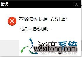 近期有网友反应在windows 10操作系统中无法安装软件的现象,在安装软件的时候出现了“不能创建临时文件”的错误提示,该怎样办呢?如下图所示,该网友在深度win8系统中安装某软件的时候截取的图标,显示错误5 拒绝访问 。