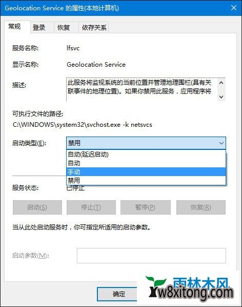 3、将Geolocation service服务启动类型设置为手动,打开“确定”