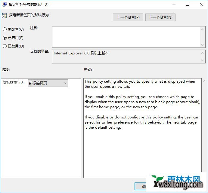 2、win8带有新闻提要的浏览器标签页在哪关闭?找到并打开指定新标签页的默认行为,设置为已启用,确定。