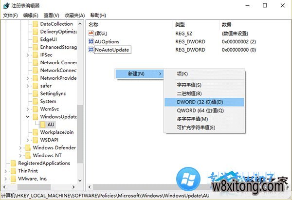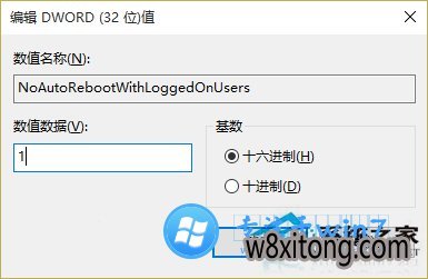 2、win8更新不提示自动重启怎样办?新建dwoRd 32位命名为noAutoRebootwithLoggedonUsers,双击打开设置数值数据为1。