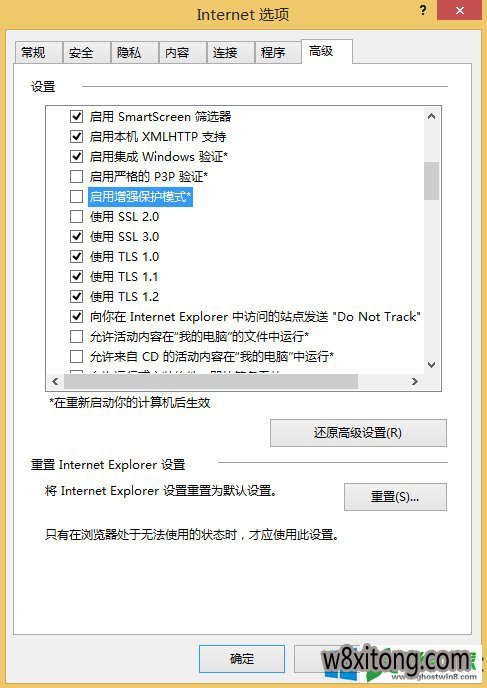 3、然后在“安全”设置中,禁用“启用增强保护模式”项(去掉前面的勾即可)