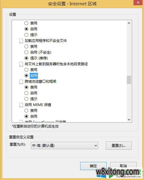 3、然后在“安全设置-internet区域”设置中,启用“将文件上载到服务时包含本地目录路径”项