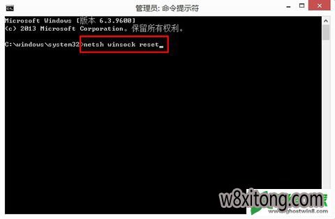 3、在打开的命令提示符窗口中,输入netsh winsock reset并单击回车;