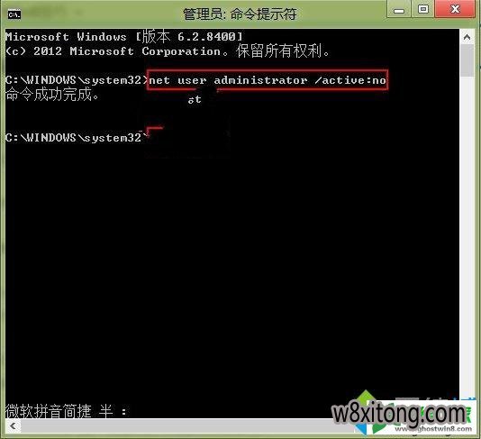 3、在“命令提示符”中输入“net user administrator /active:no”,禁用管理员帐户。