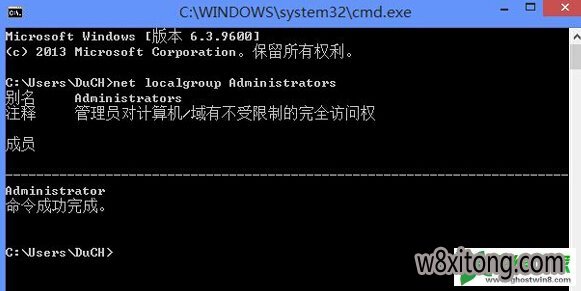 2.在打开的命令提示符窗口中,输入net localgroup Administrators 命令,然后回车,在窗口出现的反馈信息中,查看一下是否只有一个Administrator账户。