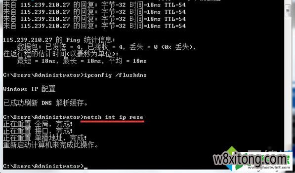 3、输入“nets hint rese”回车确认重置TCp/ip协议端口。如下图所示