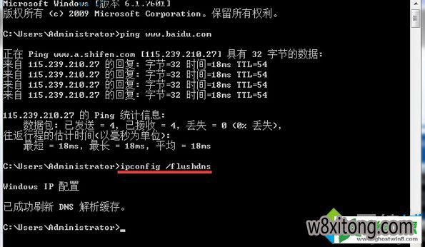 2、检测完网速之后,点击输入“ipconfig /flushdns”回车确认刷新dns缓存。如下图所示: