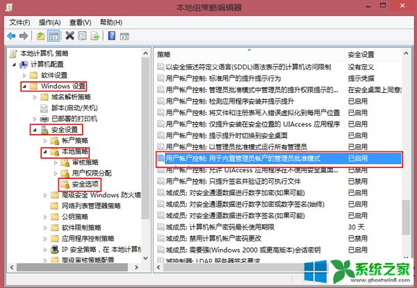 2、在本地策略编辑器窗口依次展开windows设置 》 安全设置 》 本地策略 》 安全选项再右侧找到“用户帐户控制:用于内置管理员帐户的管理批准模式” 设置为启用即可