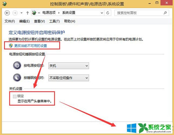 4、打开后,我们可以看到“锁定”选项没有被勾选,大家会发现不能勾选,我们选要点击上方的“更改当前不可用的设置”,然后勾选“锁屏”,最后保存修改。