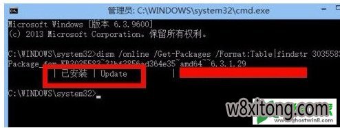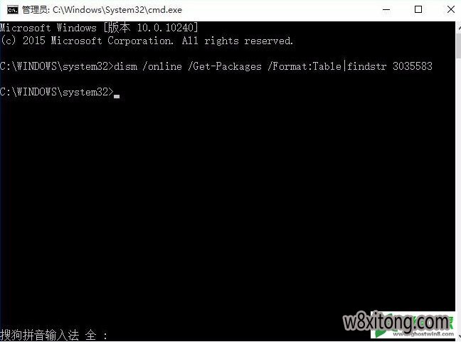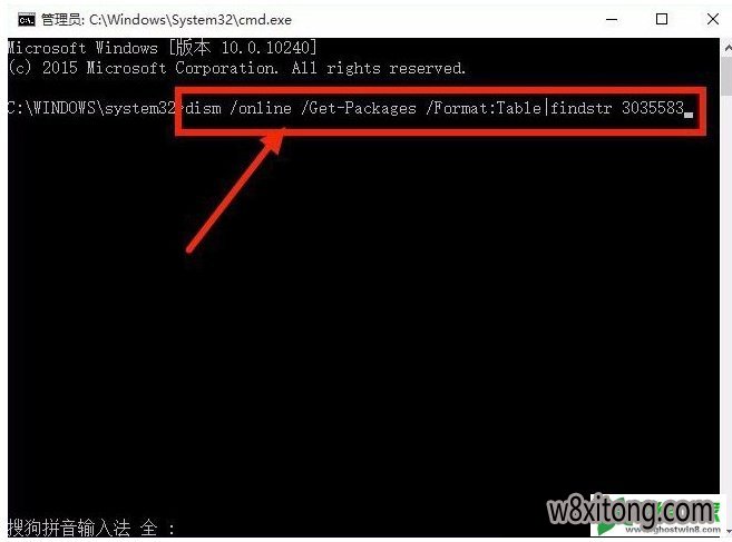3、然后会跳出下图,在下图内输入:dism /online /Get-packages /Format:Table|findstr 3035583,按Enter键执行。如下图所示: