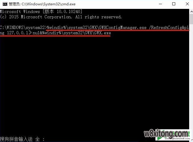 6、重复执行步骤1、2的操作,以管理员的身份打开cmd,然后输入:%windir%\system32\Gwx\GwxConfigManager.exe /RefreshConfig&ping 127.0.0.1》nul&%windir%\system32\Gwx\Gwx.exe,按Enter键执行。