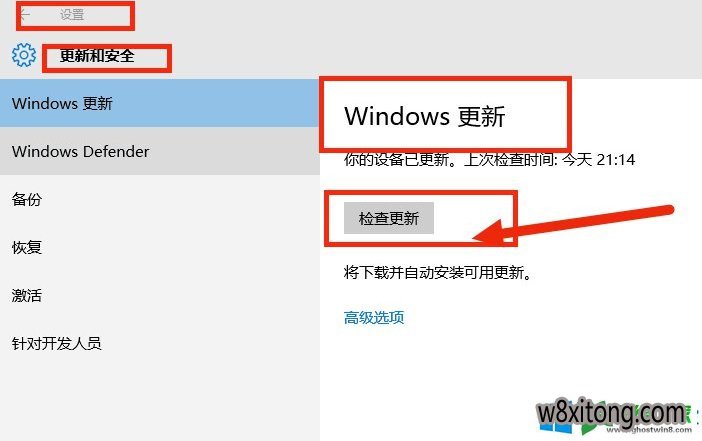 5、如果您显示没有安装,则点击开始--设置--更新与安全--windows更新--检查更新,更新安装完成后,重新启动计算机。如下图所示: