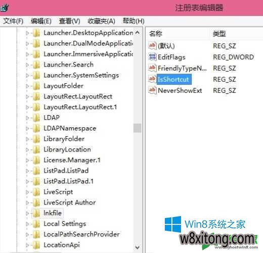 2、展开HKEY_CALssEs_RooT\lnkfile,查看右窗格是否有isshortcut键值,如果没有新建一个;