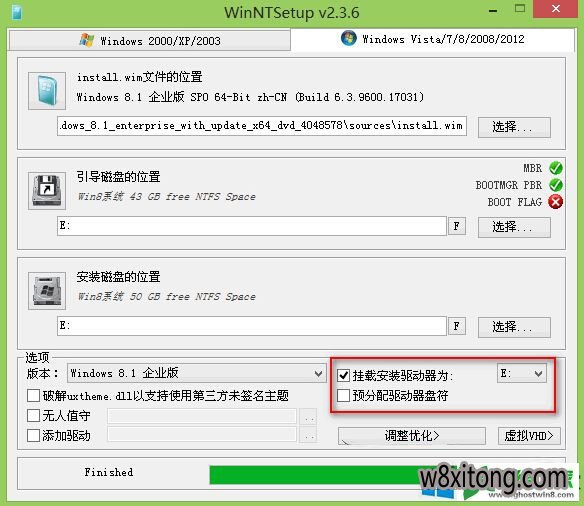如上图所示,在使用winnTsetup进行安装win8.1系统的时候,我们需要注意 “挂载安装驱动器为”选项要勾选,下面的“预分配驱动器盘符”也要勾选,然后再开始安装。