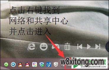 1、点击屏幕右下角的网络图标,点击右键找到网络和共享中心,点击进入。