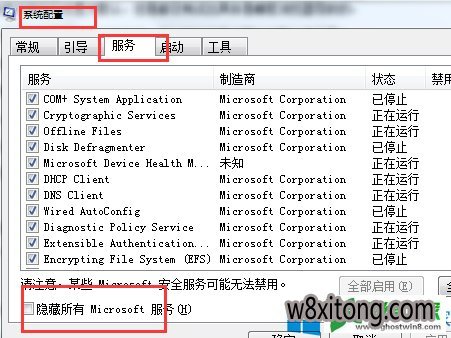 3、进入“系统配置”,选择“服务”,勾选左下角“隐藏所有Microsoft服务“,再点击”全部禁用“,点4击”应用“;
