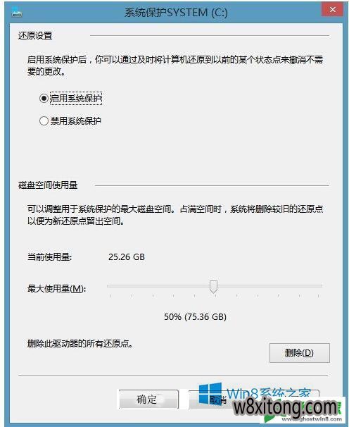 右键桌面的计算机图标-属性-系统保护-配置 可以看见当前系统保护使用量为25.26G,上限闸门为75.63G,所以每次安装/卸载软件都会自动备份创建还原点来占用