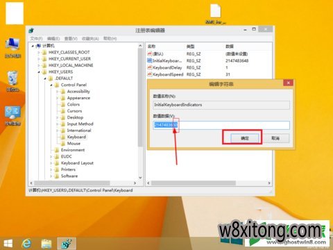 很多用户都喜欢在电脑上安装win8系统,但是有时候可能会遇到win8系统开机数字小键盘灯不亮的情况。最近有不少用户到本站咨询win8系统开机数字小键盘灯不亮的问题该怎么处理?虽然解决方法很简单,但是大部分用户不清楚win8系统开机数字小键盘灯不亮到底要如何搞定?其实步骤很简单,只需要方法1 按win+R键,输入regedit,依次找到HKEY_UsERs - dEFAULT - Controlpanel - Keyboard,将它右边的initialKeyboardindicators的键值改为“2”,退出注册表编辑器,重新启动计算机。 方法2 重启至登陆界面,按亮numlock键,再次重启,以后每次灯都会自动亮起。就ok了。本教程就给大家演示一下win8系统开机数字小键盘灯不亮详细的解决步骤: