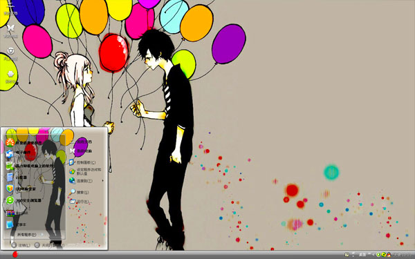 一世不变情侣w10主题桌面,由系统之家最新原创推荐下载的一款精美爱情W10电脑桌面主题美化包,在灰色的桌面背景上,是一对卡通动漫情侣在相聚,帅哥和美女各自手中都牵着七彩气球,.....